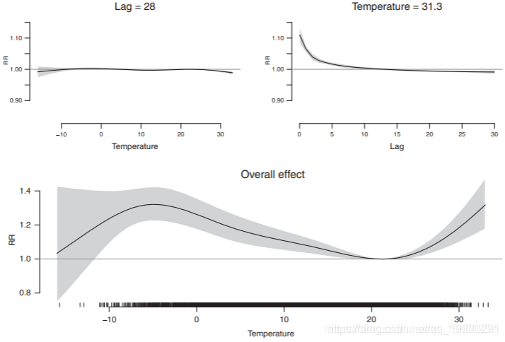 尽管3-D图是总结两个维度的总体关系的有用工具,但不能包括估计的不确定性。为了对这种关系进行更具体的评估,我们可以绘制特定温度或滞后期的影响。图2显示了特定滞后期(0、5、15和28)的温度和特定温度(-10.8、-2.4、26.5和31.3◦C)的滞后期的RR,大约对应于温度分布的第0.1、5、95和99.9百分位数(称为中度和极端寒冷和炎热)。温度的总体影响,将分析中考虑的30天滞后期的贡献相加,包括在下面。温度-死亡率关系似乎随着滞后期而变化,滞后期0和5的最低死亡率点不同(左上角的前两个图)。该图证实,如果与中度高温相比,极端高温的影响更为滞后,其显著风险分别持续10天和3天(右上角第三和第四张图)。尽管如此,只有极端高温表明可能存在收获效应,在滞后15天后开始。相对于21◦C的总体估计RR是1.24(95%CI:1.13-1.36)和1.07(95%CI:1.03-1.11),对于极端和中度高温来说。寒冷的温度显示出完全不同的模式,中度寒冷的影响持续到滞后25天(右上角的前两个图)。此外,寒冷的影响似乎趋于平缓,中度寒冷的总体RR略高,为1.30(95%CI:1.20-1.40),而极度寒冷的RR为1.20(95%CI:1.04-1.39)(如下图)。