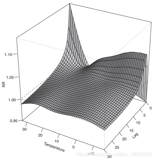尽管参数化很复杂,但对DLNM参数的估计和推断并不比任何其他广义线性模型产生更多的问题,而且在指定交叉基变量后,可以用普通的统计软件进行。然而,虽然(4)中较简单的DLM的解释是直接的,包括报告(6)中每个滞后的估计线性效应bˆ,但更复杂的DLNM的结果与平滑的非线性依赖关系很难总结。一个解决方案是为每个滞后期和适当的暴露值建立一个预测网格,使用三维图来提供沿两个维度变化的影响的总体情况。