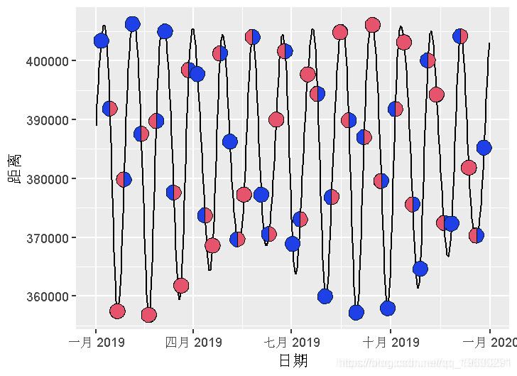 ggplot(lunardist, aes(date, distance)) + geom_line() + # 将下层绘制成一个完整的圆 geom(data = phase, ratio = 1, size = 5, fill = "black") +