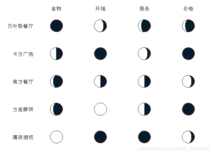 # 首先,我们将数据变化为 "长 "格式,以方便绘图。 rest <- reshape( restaurants, timevar = "Category", direction = "long" ) ggplot(rest, aes(0, 0)) + geom(aes(ratio = (Score - 1) / 4), fill = "black") + theme( panel.grid = element_blank()