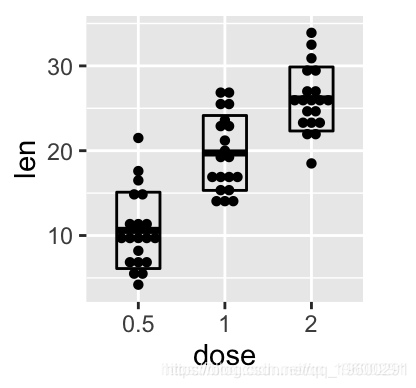 p <- ggplot(df, aes(x=dose, y=len)) + geom_dotplot(binaxis='y', stackdir='center')