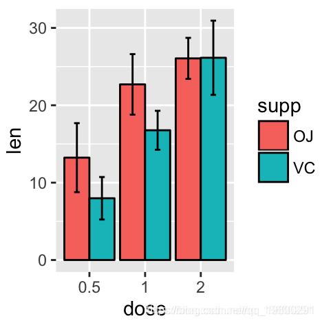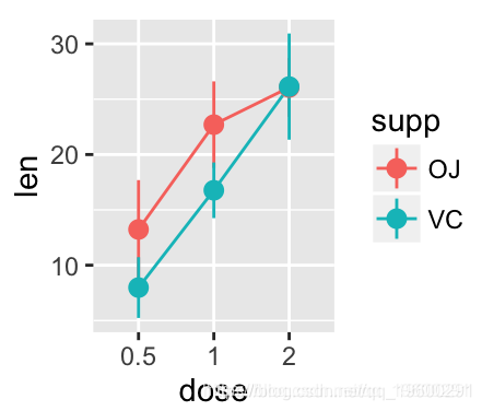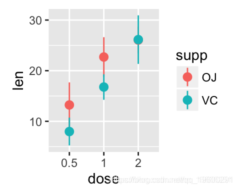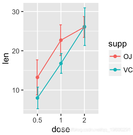 df2 <- data_summary(ToothGrowth, varname="len", groupnames=c("supp", "dose")) # 把剂量转换为因子变量