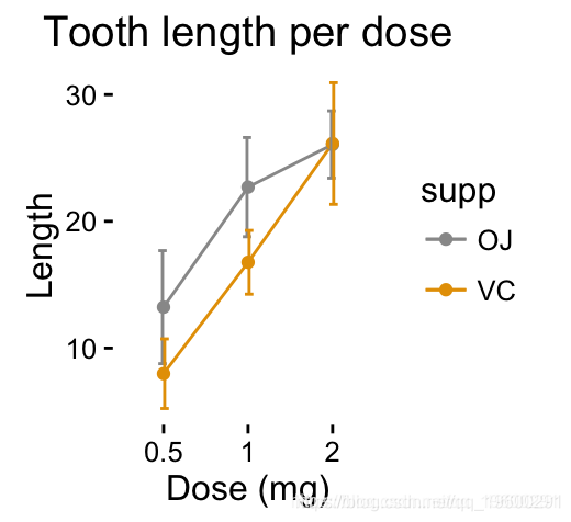p+labs(title="Tooth length per dose", x="Dose (mg)", y = "Length")+ theme_classic() + scale_color_manual(values=c('#999999','#E69F00'))