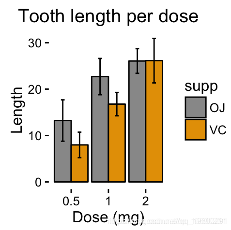 在下面的例子中,我们将绘制每组中牙齿长度的均值。标准差用来绘制图形中的误差棒。