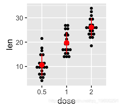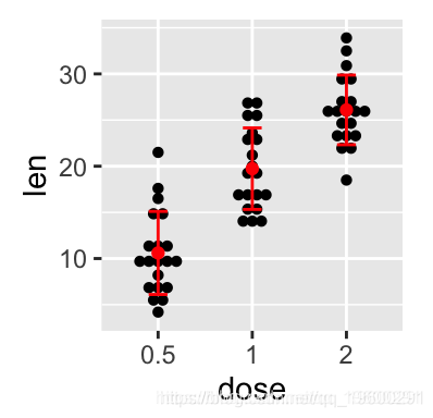 _summary(fun.data=mean_sdl, fun.args = list(mult=1), geom="errorbar", color="red", width=0.2) + stat_summary(fun.y=mean, geom="point", color="red")