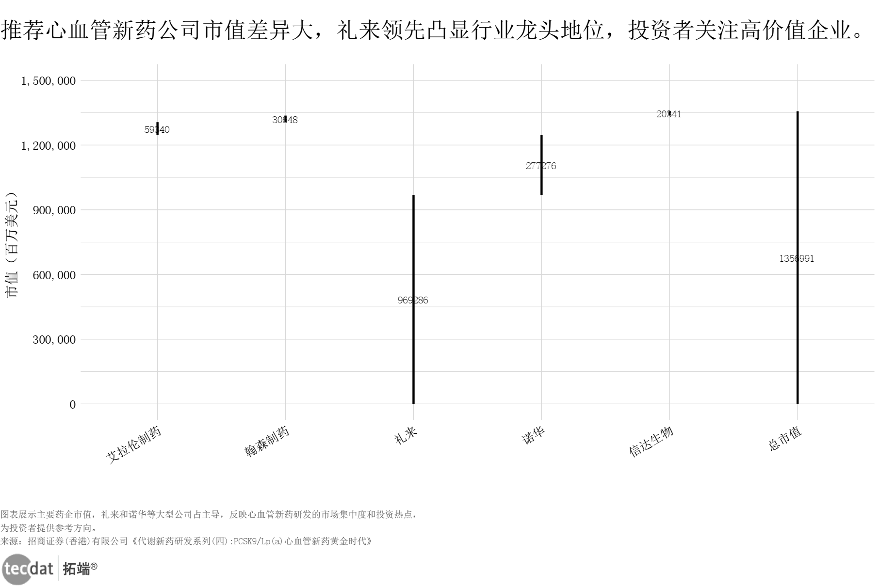 心血管新药领域的公司市值分化明显,礼来以969286百万美元市值领跑,诺华、艾拉伦制药等紧随其后,这种差距反映了企业在研发管线厚度、商业化能力、全球渠道布局上的综合实力。