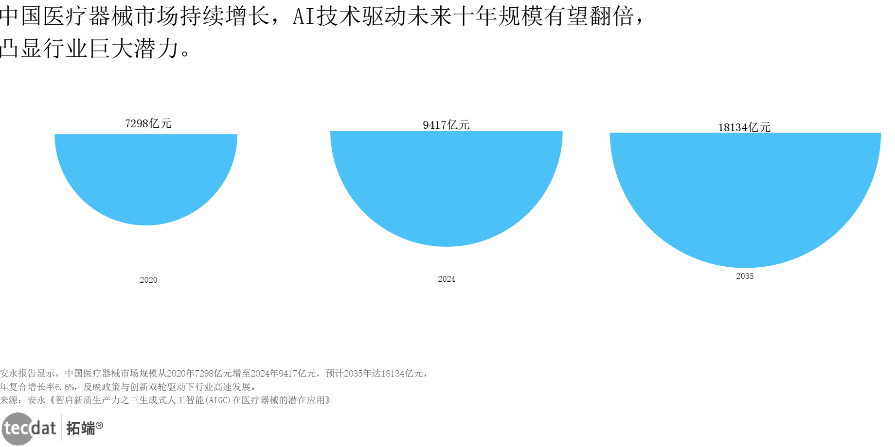 中国医疗器械市场规模趋势半圆面积图5图表数据及PDF模板已分享到会员群。3秒解读:中国医疗器械市场规模持续增长,2024-2035年CAGR约6.2%,设备和耗材两大品类同步扩张,智能化升级驱动行业价值提升。对应人群行动建议:初创企业可聚焦细分场景的智能设备创新,如便携式AI诊断设备、基层适配型智能器械;成熟企业可布局数字化服务平台,通过数据赋能提升客户粘性与复购率。