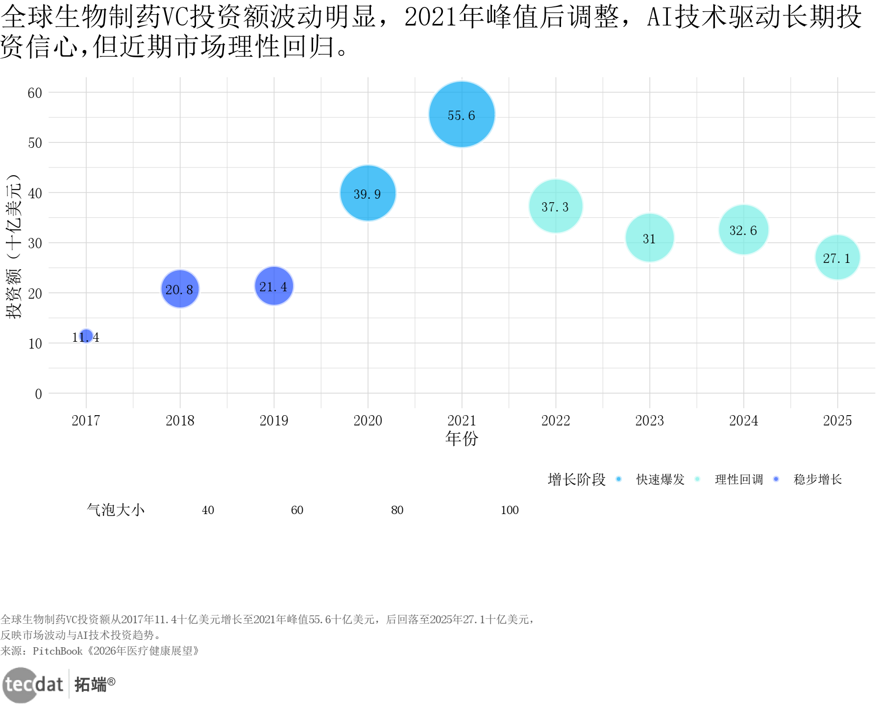 探索观点全球生物制药VC投资额趋势气泡图2图表数据及PDF模板已分享到会员群。3秒解读:全球生物制药VC投资额在2021年达峰值后回落,2025年开始复苏,早期项目因AI赋能成为投资热点,细分赛道龙头估值持续提升。对应人群行动建议:投资人可重点关注AI药物研发平台型企业,聚焦靶点发现、临床试验优化等核心环节;初创药企可采用”AI+细分靶点”的组合策略,强化技术壁垒,提升融资竞争力。
