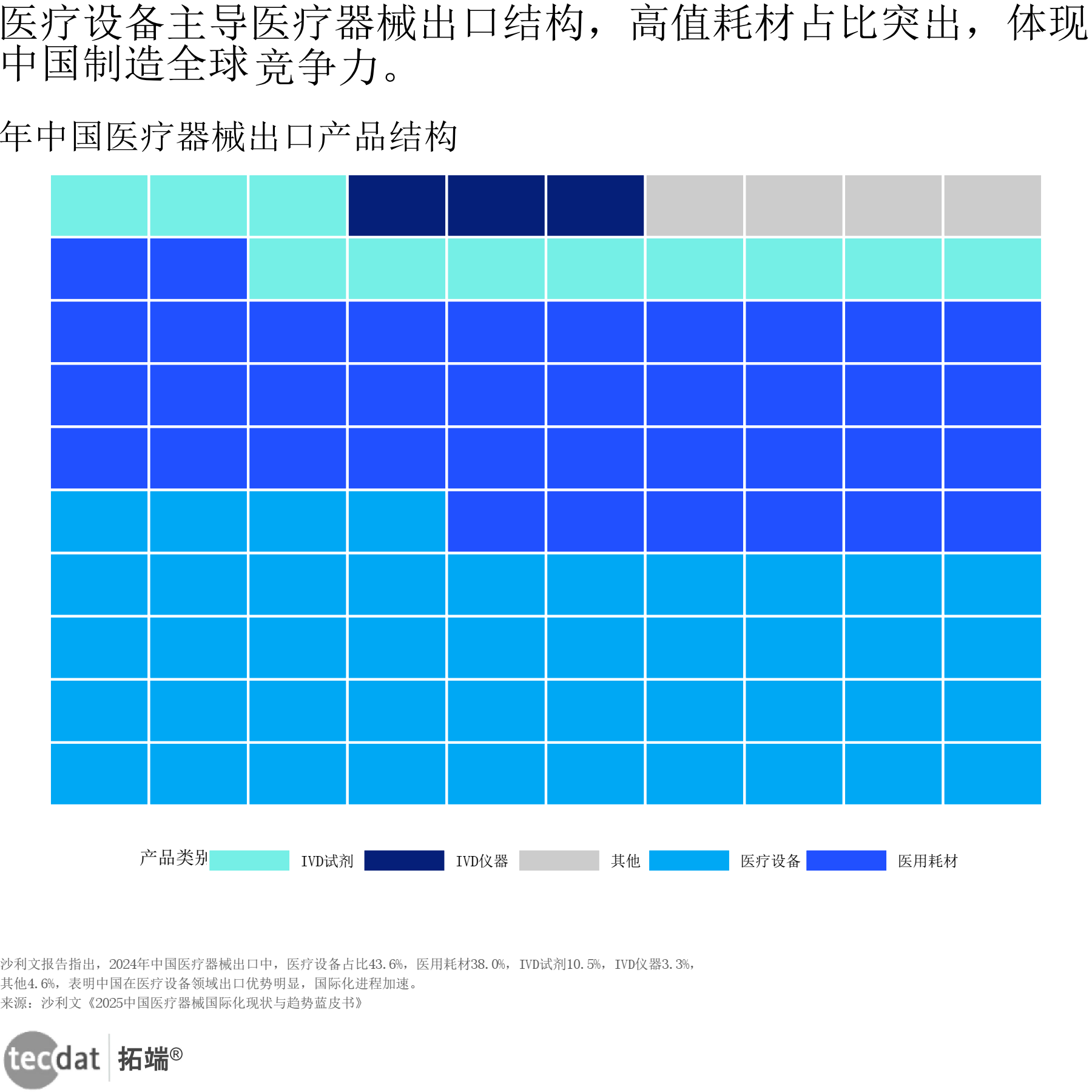 2024年中国医疗器械出口产品结构华夫图6图表数据及PDF模板已分享到会员群。3秒解读:医疗设备和医用耗材是中国医疗器械出口的核心品类,合计占比超80%,IVD试剂和仪器合计占比13.8%,产品结构向高附加值倾斜。对应人群行动建议:医疗器械企业可聚焦医疗设备的核心技术突破,重点布局影像设备、生命支持设备等高端品类;针对新兴市场,可优先布局性价比高的医用耗材和基础医疗设备,快速抢占市场份额。