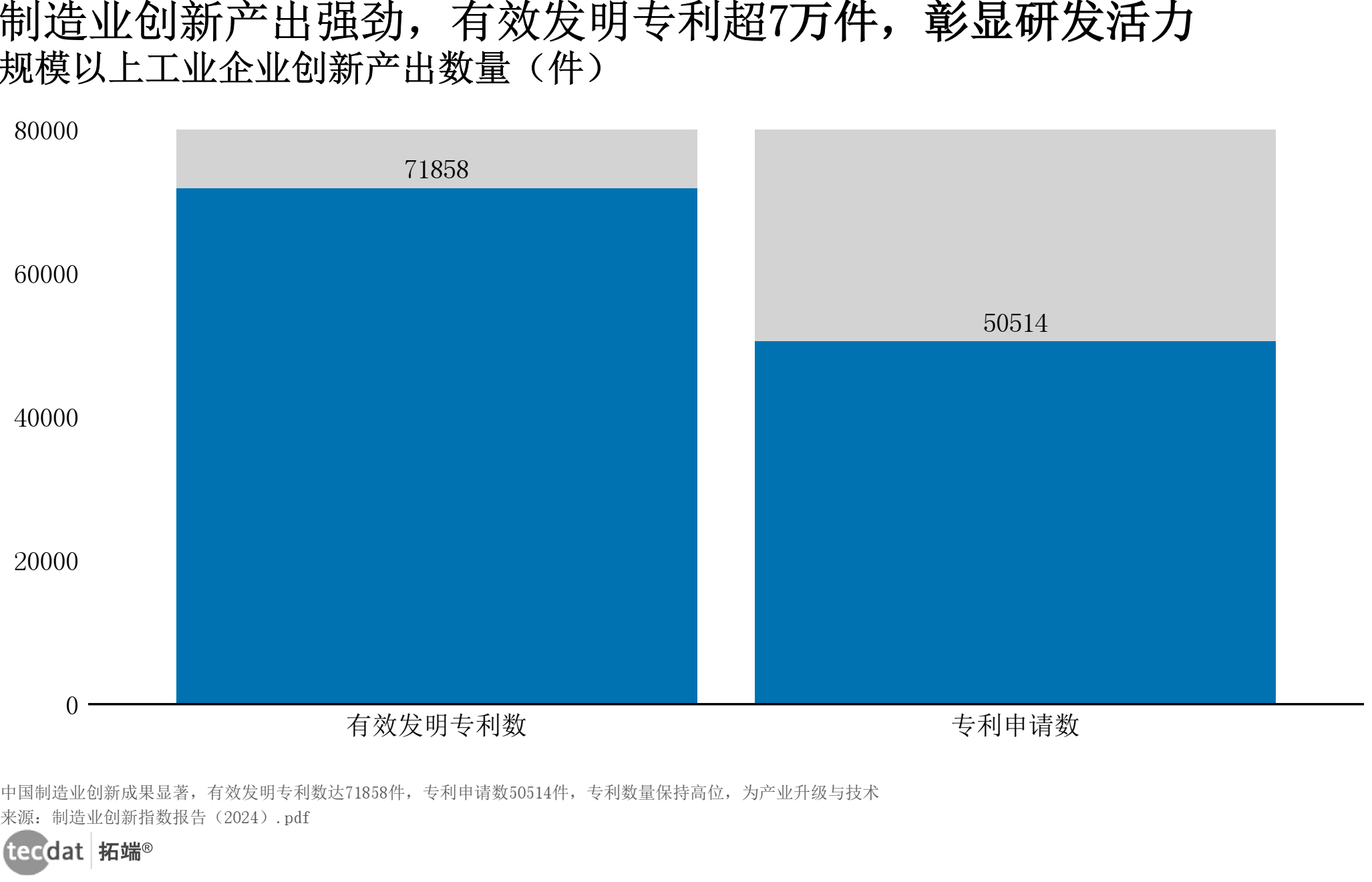 数字化不只是“降本”,更要“创新”。《制造业创新指数报告(2024).pdf》里有组数据很震撼:2024年规模以上工业企业有效发明专利数达71858件,比2023年多了2万多件——这说明头部企业已经靠创新拉开差距了。 我们把创新产出数据做成了条形图,能清晰看到“专利申请”和“有效专利”的差距,这背后是“从研发到落地”的转化能力: