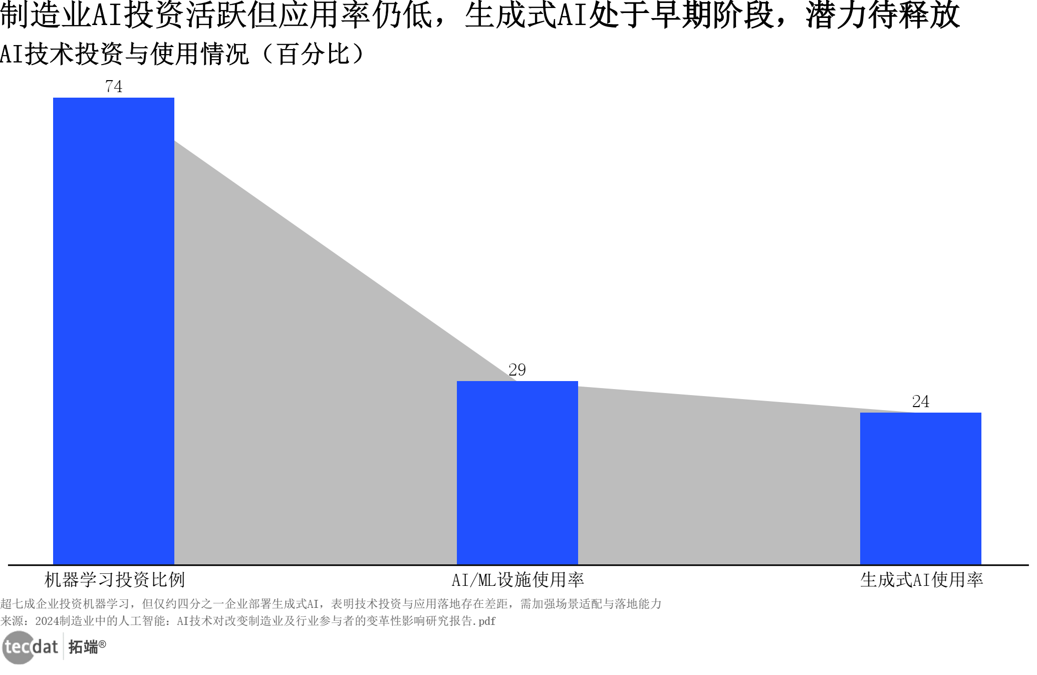 但有个问题:既然AI这么好用,为什么只有29%的企业真正用起来?《2024制造业中的人工智能:AI技术对改变制造业及行业参与者的变革性影响研究报告.pdf》给出了答案——投资和使用的“断层”: