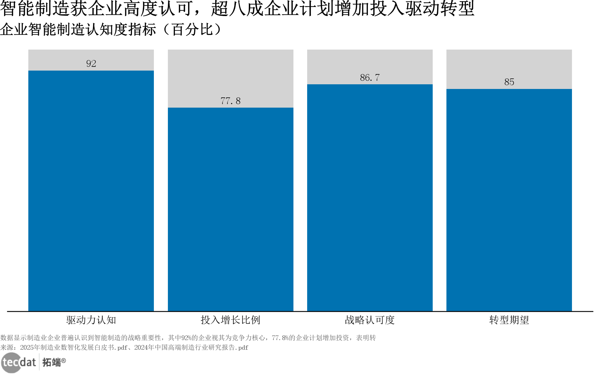 10年前,制造业谈数字化,大多是“买设备、上系统”——生产线装传感器、车间通WiFi,就觉得是“智能工厂”了。但2023年之后,风向变了:《2025年制造业数智化发展白皮书.pdf》里提到,86.7%的企业把数字化当成“生存必修课”,而不只是“加分项”。 为什么会变?2021年以来,原材料价格波动超30%,人工成本年均涨8%,客户还要求“小批量、快交付”——传统模式根本扛不住。就像江苏一家纺织厂老板说的:“以前一批货做1000件能赚钱,现在客户要100件还得5天交货,没数字化根本不敢接。” 这时候,企业对数字化的认知就成了关键。我们整理了《2025年制造业数智化发展白皮书.pdf》和《2024年中国高端制造行业研究报告.pdf》的调研数据,用图表清晰呈现企业的真实态度:智能制造发展态势_企业认知度条形图图表数据及PDF模板已分享到会员群 从图表能看到,92%的企业认为数字化是“竞争力核心”,但只有77.8%计划增加投入——这中间的差距,就是“想转但不敢转”的痛点。3秒解读:认知到位了,但行动还犹豫;行动建议:制造企业老板可先做“小成本测试”,比如用AI做质检试点,而非直接投千万建工厂。