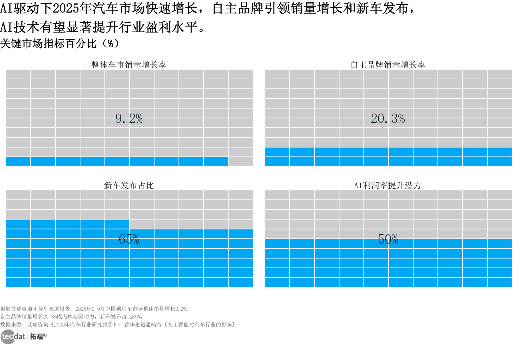 对于车企而言,AI已成为“降本增效”的必选项:通过AI优化生产流程,缺陷率可降低15%;通过AI分析用户行为,营销精准度提升25%,在行业利润率仅4.5% 的2025年,AI带来的“效率提升”直接决定企业竞争力。