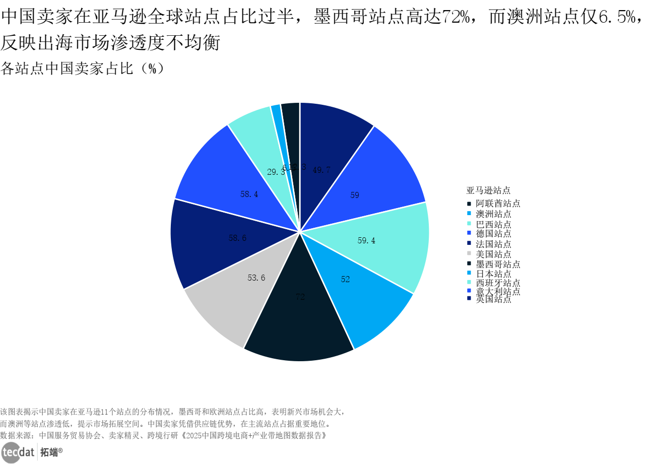 中国卖家在亚马逊各站点的占比差距显著:墨西哥站点72%的占比,意味着“中国供应链+本地化运营”的组合在新兴市场更易起量;而澳洲站点仅6.5%的占比,说明这里仍有未被挖掘的蓝海,但需突破物流时效瓶颈。