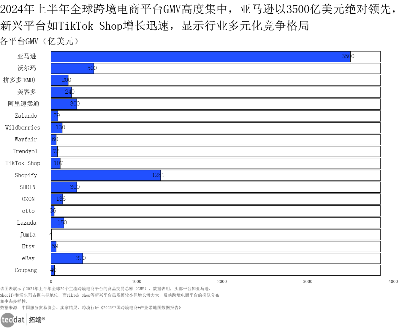 全球跨境电商平台呈现“头部压舱、新兴破局”的态势:亚马逊以3500亿美元GMV稳居第一,Shopify靠独立站生态拿下1281亿美元,沃尔玛500亿美元紧随其后;而TikTok Shop凭借“短视频种草+货架电商”模式,107亿美元GMV背后是翻倍的增速,成为不少中小卖家的“起量新选择”。
