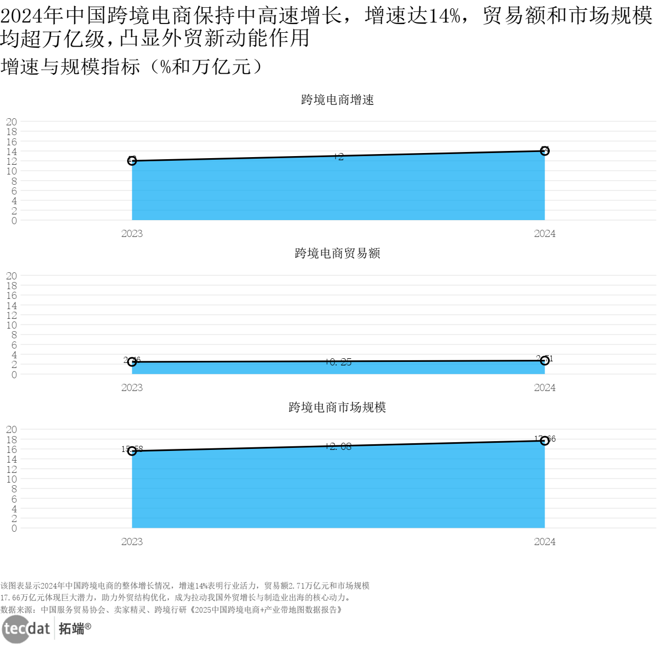 | 跨境电商市场规模 | 2024年商品进出口总额口径2.71万亿元 | 2024年全市场规模口径17.66万亿元 | 统计口径不同,差额为服务类等其他收入 | 报告1聚焦商品进出口,报告2涵盖全产业链收入(含物流、服务等) |