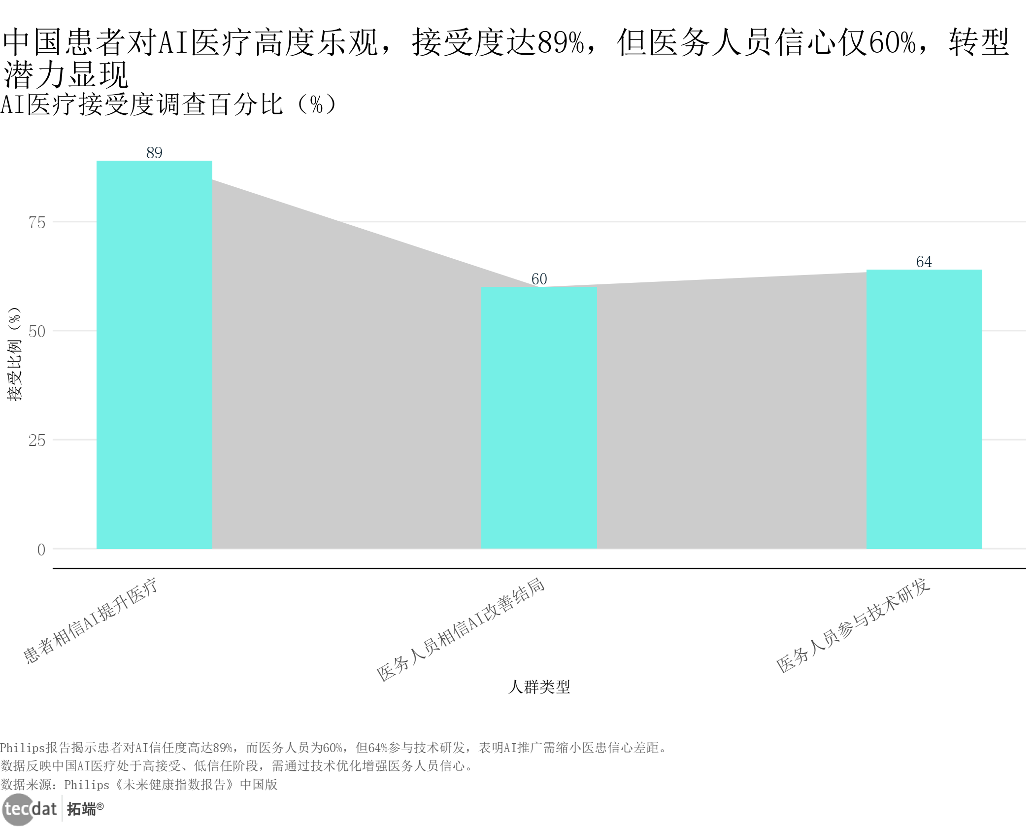 患者对AI医疗的接受度高达89%,但医务人员对AI改善临床结局的数字化信任度仅60%,供需双方的认知差距成为行业数字化转型的关键障碍。