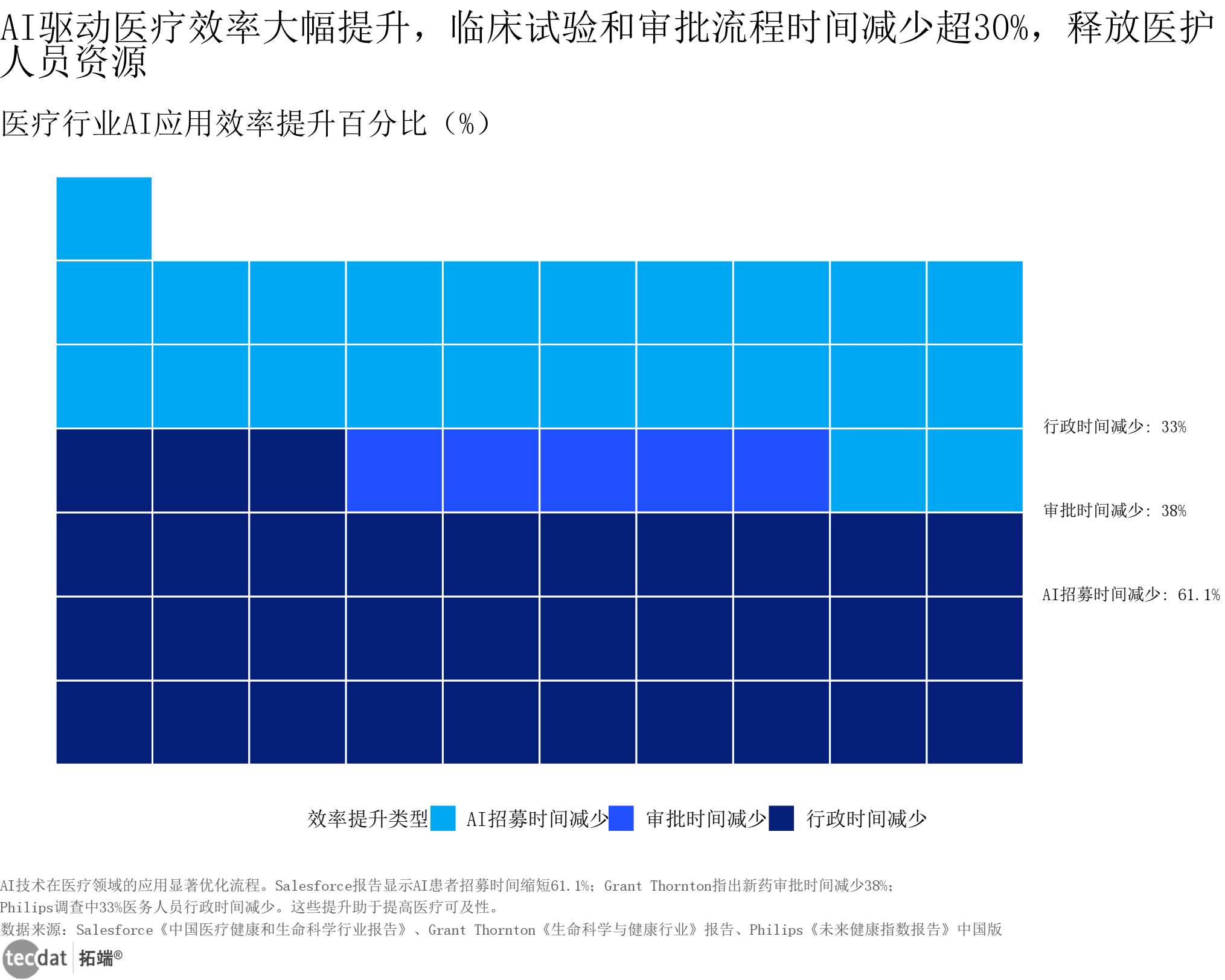 AI在医疗领域的应用实现了“数字化降本增效”,临床试验招募时间缩短61.1%,新药审批时间减少38.0%,行政时间节省33%,释放大量医护资源。