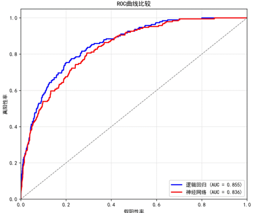 ROC曲线比较显示,逻辑回归的AUC略高于神经网络(0.8549 vs 0.8359),两者均表现出良好的预测能力。