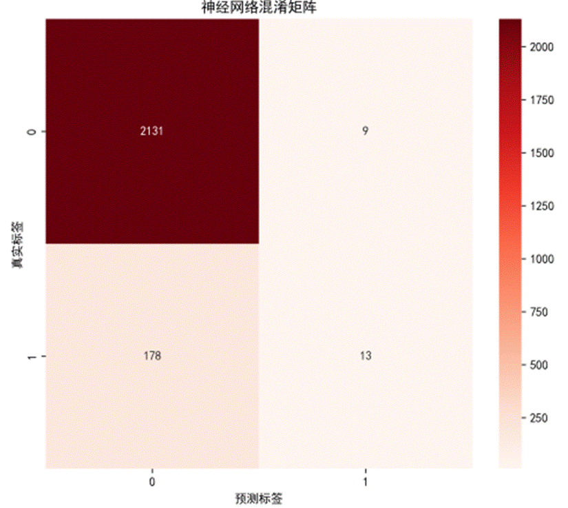 混淆矩阵分析显示,模型正确识别了148名高血压患者,漏诊43名;在非高血压人群中,正确排除1647名,误判493名。较高的召回率使其非常适合社区大规模初筛,能够最大限度减少漏诊。神经网络模型在测试集上的准确率为0.9198,精确率为0.5909,但召回率仅为0.0681。