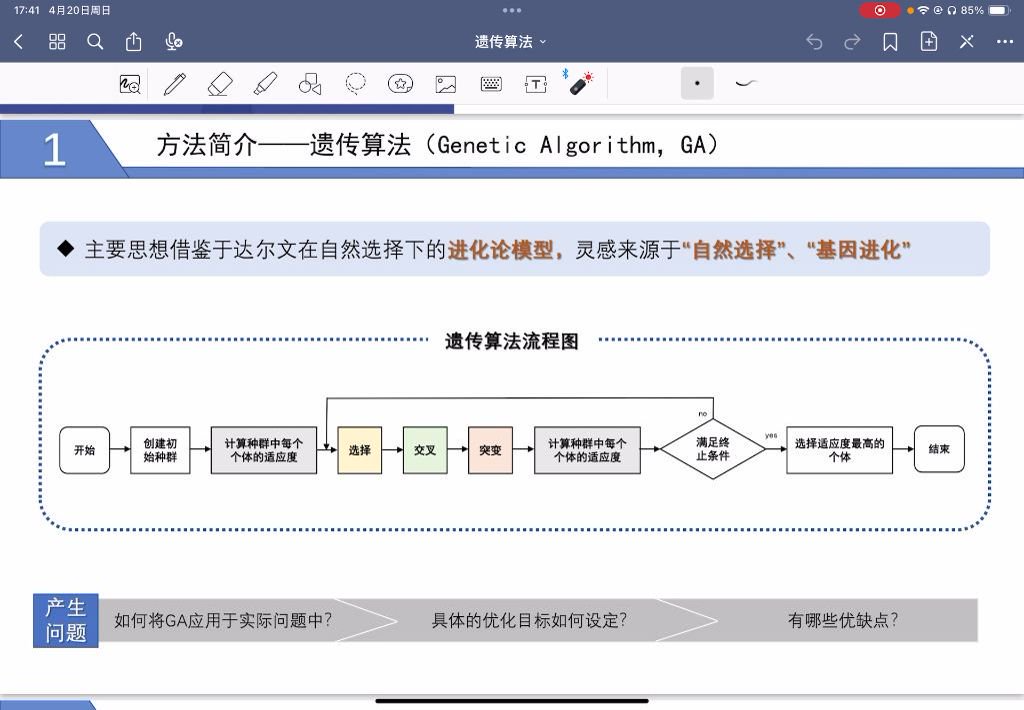 遗传算法简介 | 模拟生物进化的全局优化算法,通过“选择-交叉-突变”找到最优解,适用于组合优化问题 | 物流路径规划、工厂生产调度、机器学习超参数优化;易混淆“交叉”和“突变”——交叉是组合,突变是随机修改 | 优点:全局搜索能力强、模型要求低;缺点:计算成本高、参数调优复杂 |