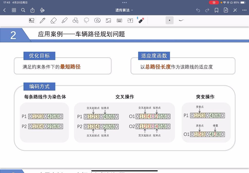 算法原理 | 用“基因序列”表示解(如路径编码),用“适应度”评估解的优劣,多轮进化后得到最优解 | 编码示例:“0 1 2 3 0 4 5 6 0”对应两辆车的配送路线;突变后必须修复重复客户编号 | 适应度得分规则需结合业务(如路径越短得分越高);交叉片段需避开仓库编号 |