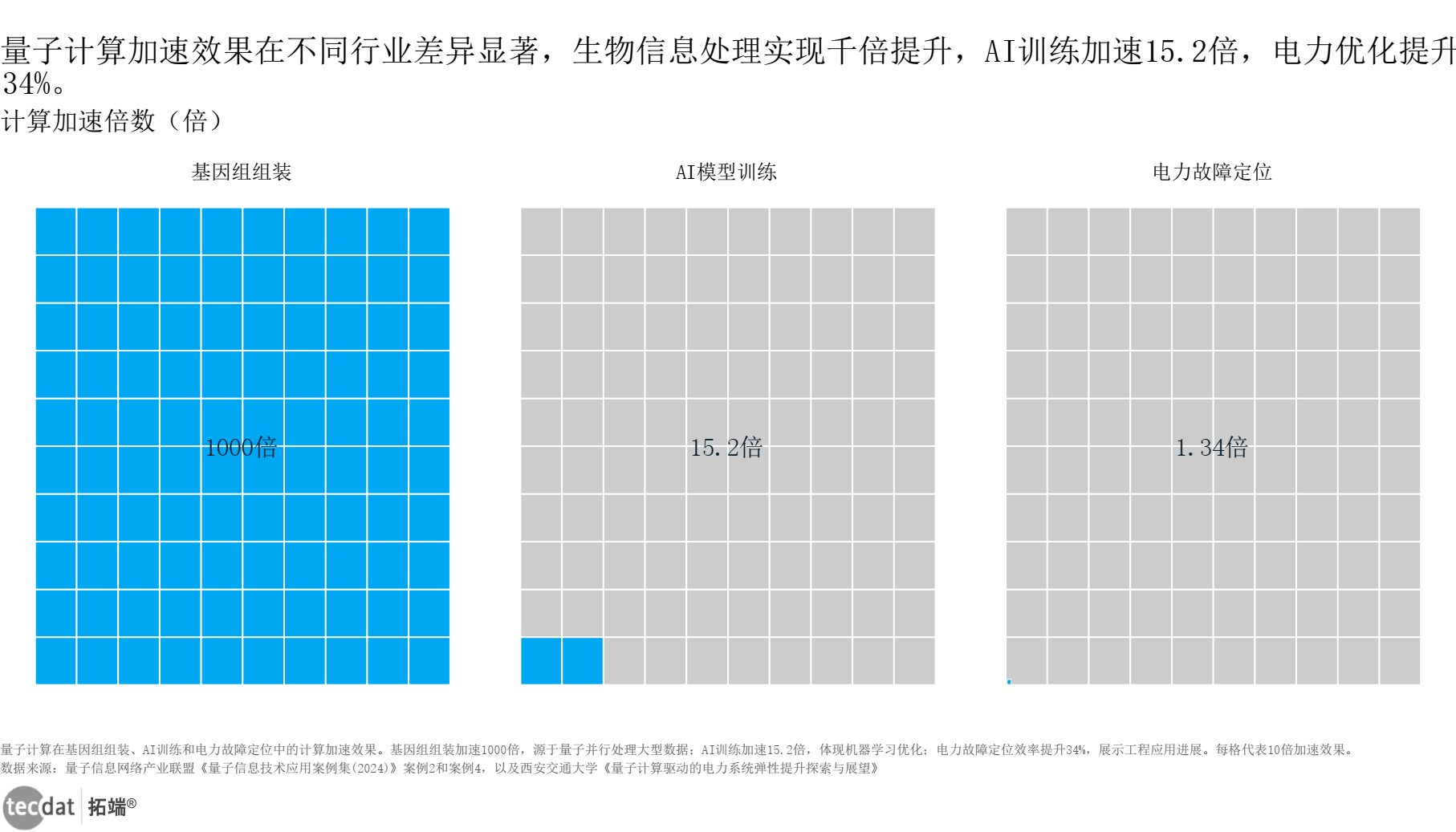 3秒解读:基因组组装加速1000倍,美国已应用于生物医药企业的新药研发;AI模型训练加速15.2倍,美国谷歌、微软已用于大模型优化;电力故障定位加速1.34倍,中国仅在个别电力企业试点,应用范围有限。