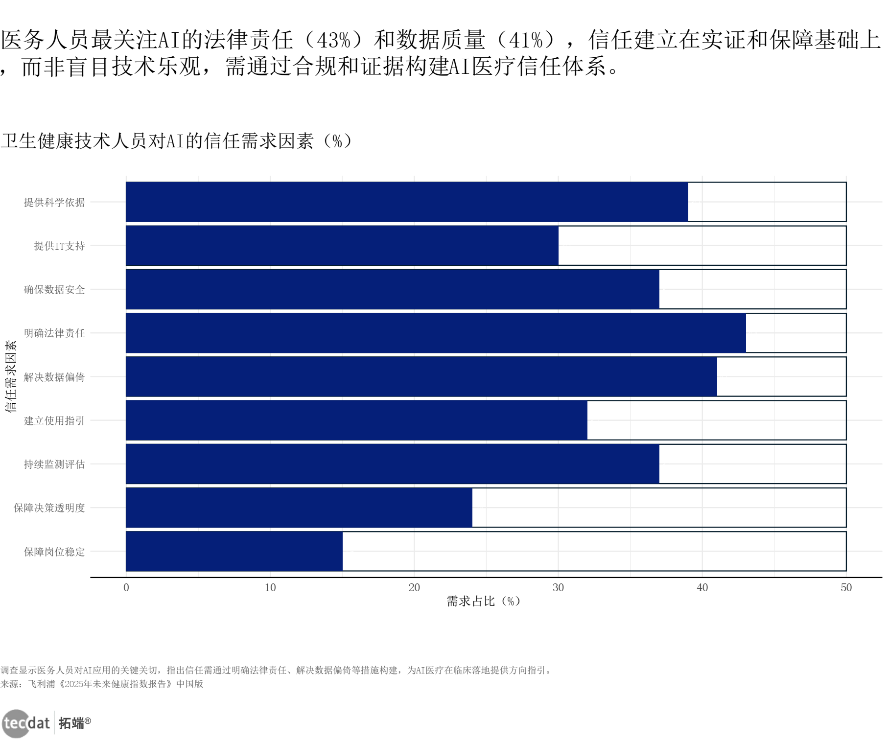 医务人员对AI的信任则依赖“责任明确”与“数据可靠”,43%的卫生健康技术人员认为“明确法律责任归属”是提升信任的关键,41%关注“数据偏倚与质量问题”。