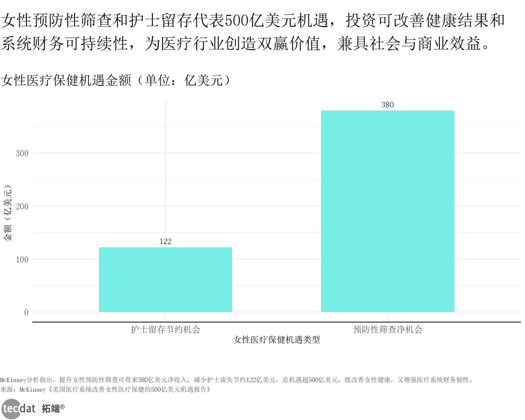 这种不平等背后是巨大的市场机遇,McKinsey分析指出,提升女性预防性筛查可带来380亿美元净收入(减少晚期治疗成本+提升筛查服务收入),减少护士流失(女性占护士群体主力)可节约122亿美元(降低招聘与培训成本),总机遇规模超500亿美元。
