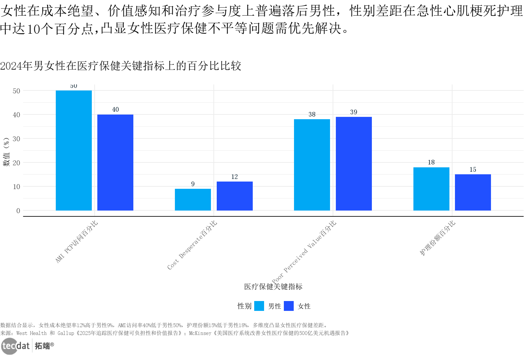 女性的Cost Desperate率(12%)高于男性(9%),跳过处方药的比例(20%)也高于男性(15%);在急性心肌梗死(AMI)诊疗中,女性的PCP访问率(40%)低于男性(50%),护理份额占比(15%)同样低于男性(18%),多维度凸显性别差距。