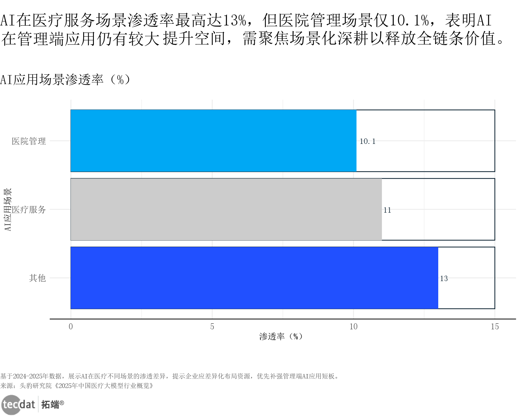 AI已不再是医疗健康行业的“锦上添花”,而是成为破解资源短缺、提升效率、降低成本的核心引擎。从患者需求到医务人员信任,从场景渗透到技术迭代,AI正重构医疗健康的全价值链。AI医疗的场景渗透已实现从临床到运营的全覆盖,中国医疗大模型已在多场景实现规模化应用,其中医疗服务(医学影像、智能诊疗)渗透率11.0%,医院管理(质量管理、设备管理)渗透率10.1%,健康管理与医学科研渗透率13.0%,形成“诊疗为核、管理协同”的应用格局。