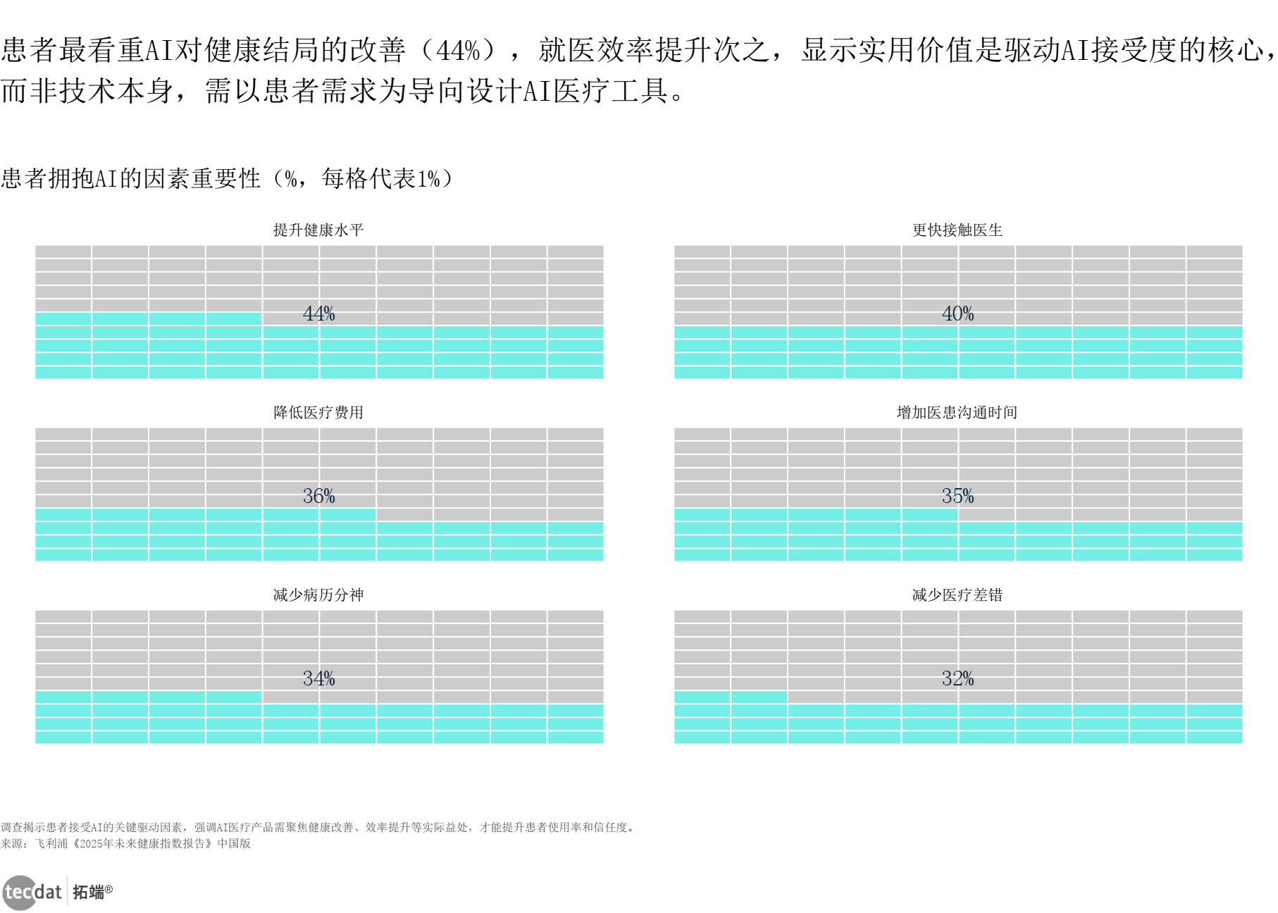 3秒解读:患者对AI的期待聚焦“实效价值”,而非技术本身,减少医患沟通时间的担忧(68%)是主要顾虑。