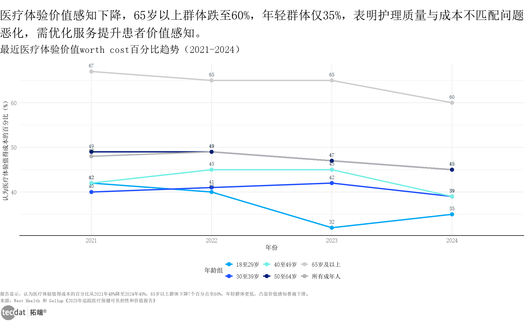 更值得关注的是,患者对最近医疗体验的“价值认可”比例持续下降,2024年美国仅45%的成年人认为医疗体验“物有所值”,18-29岁群体仅35%,较2021年下降7个百分点;65岁以上群体从67%降至60%,是所有年龄组中降幅最大的群体之一。