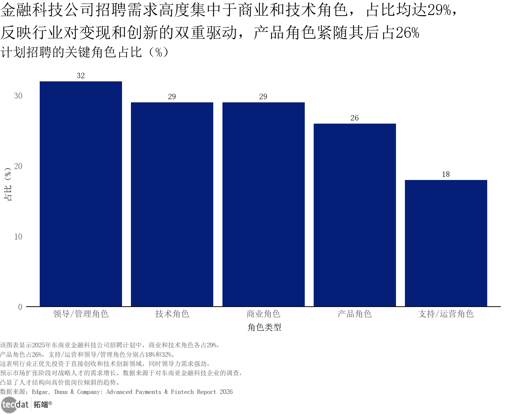 3秒解读:金融科技公司招聘需求中,领导/管理角色占比32%,商业角色与技术角色各占29%,产品角色26%,支持/运营角色18%,战略型与实干型人才需求并重。
