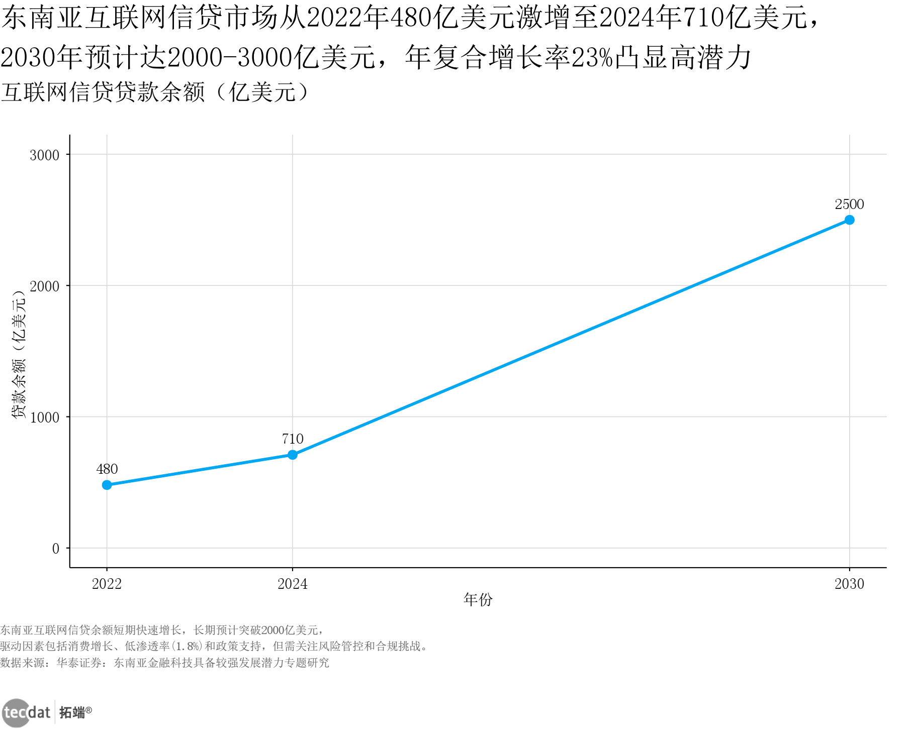 3秒解读:东南亚互联网信贷余额从2022年480亿美元增至2024年710亿美元,2030年预计达2500亿美元,年复合增长率23%,市场潜力巨大。