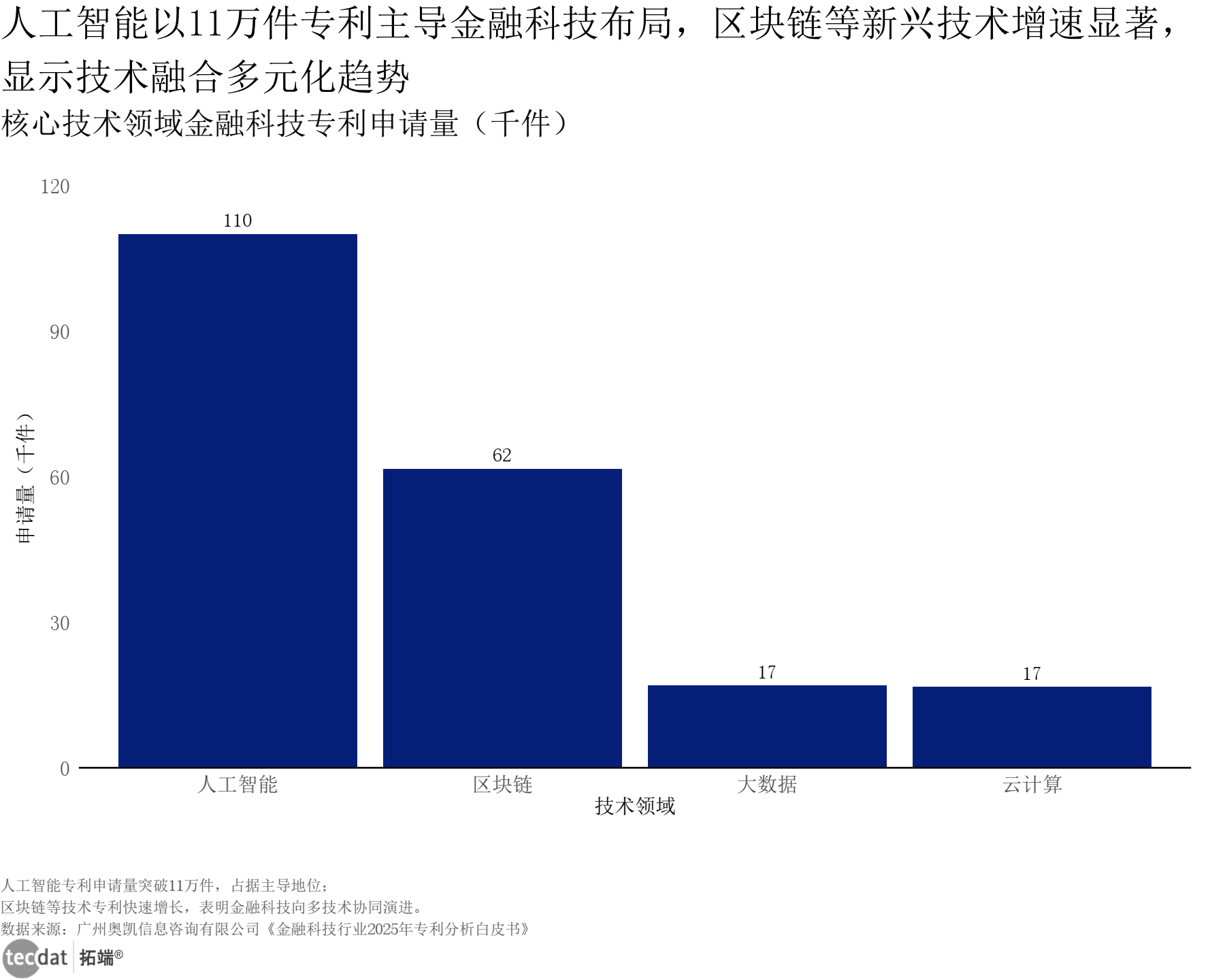 3秒解读:人工智能以11万件专利主导布局,区块链61618件、大数据16915件、云计算16609件紧随其后,技术融合趋势明显。