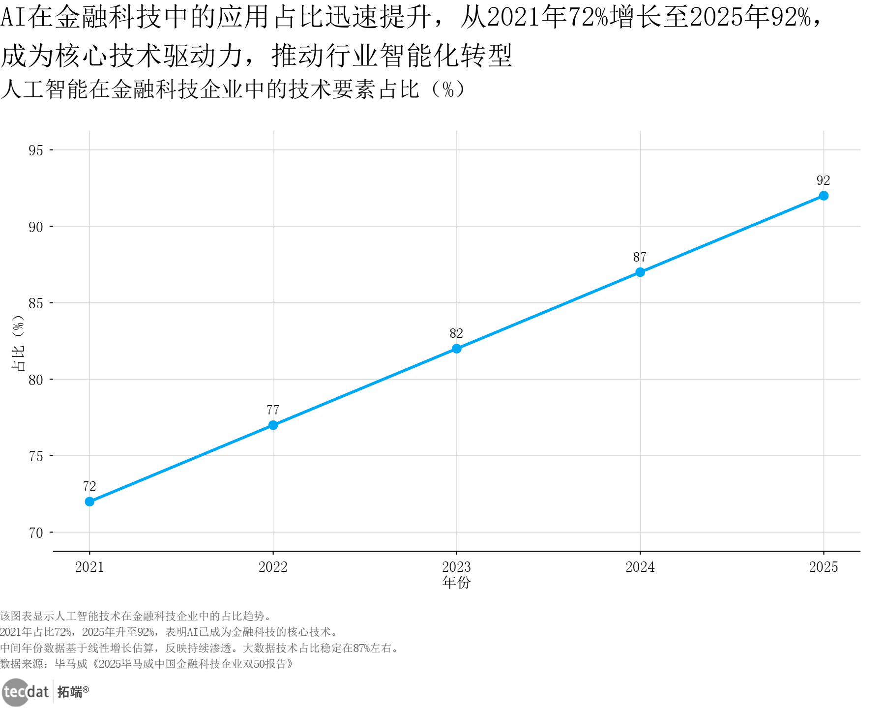 3秒解读:AI技术要素占比从2021年72%升至2025年92%,连续两年位居技术要素首位,成为金融科技创新核心动力。