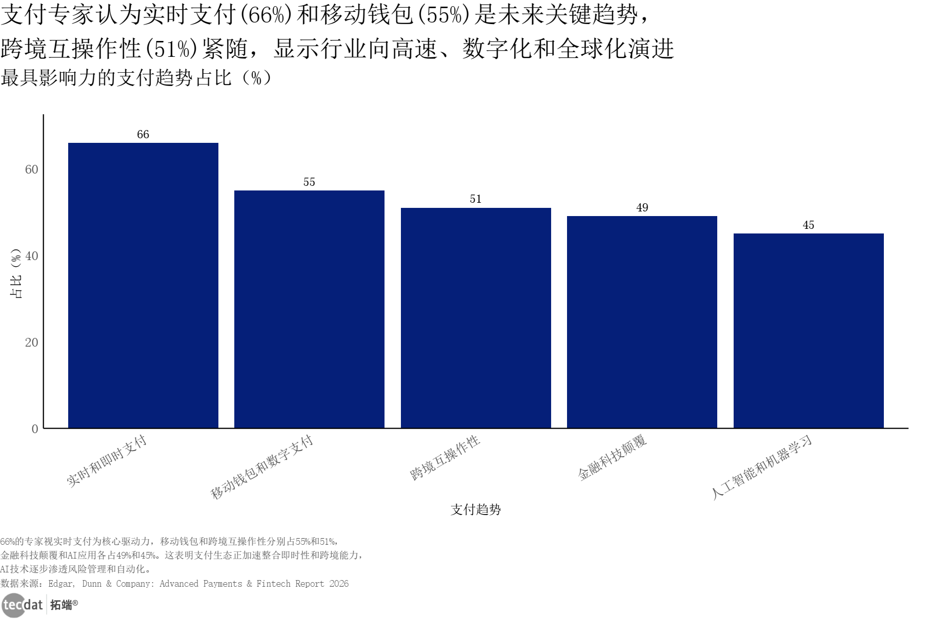 3秒解读:66%的专家认可实时和即时支付为核心趋势,55%看好移动钱包和数字支付,51%关注跨境互操作性,AI与机器学习应用占比45%,支付行业向高速、数字化、全球化演进。