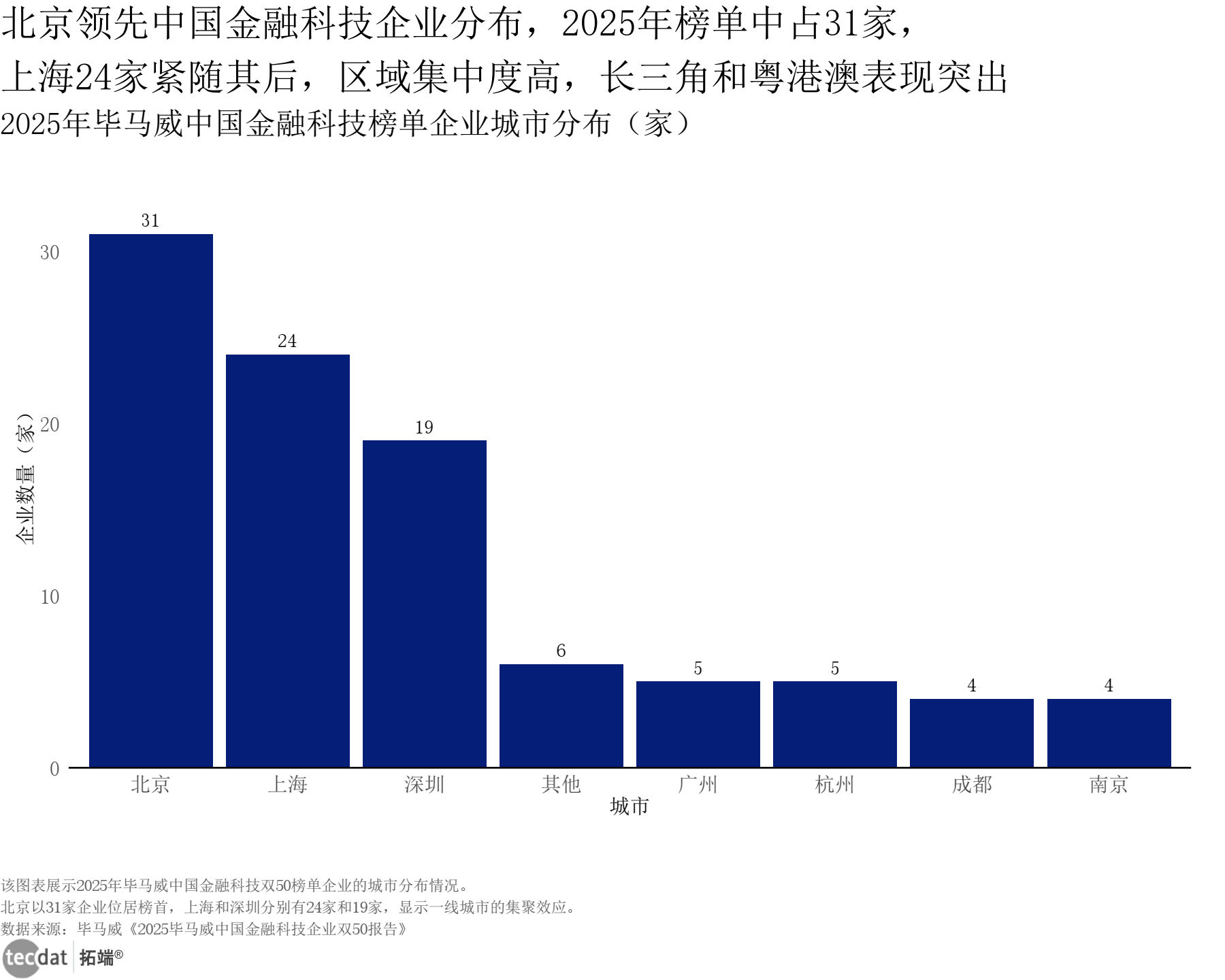 3秒解读:北京以31家企业位居毕马威双50榜单首位,上海24家、深圳19家紧随其后,广州、杭州各5家,形成“北上深”第一梯队。