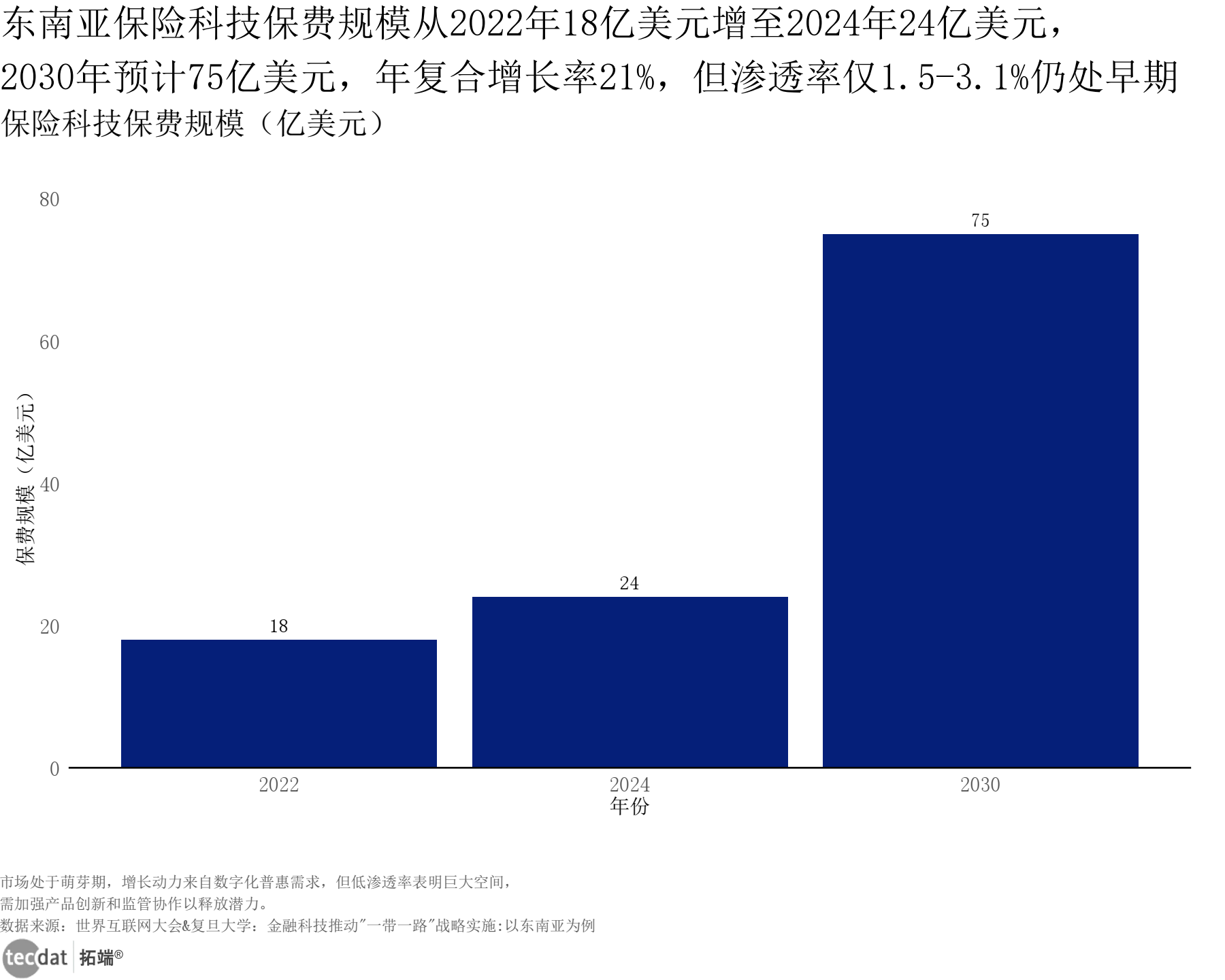 3秒解读:东南亚保险科技保费规模2022年18亿美元,2024年24亿美元,2030年预计达75亿美元,年复合增长率21%,但渗透率仅1.5-3.1%,处于发展初期。