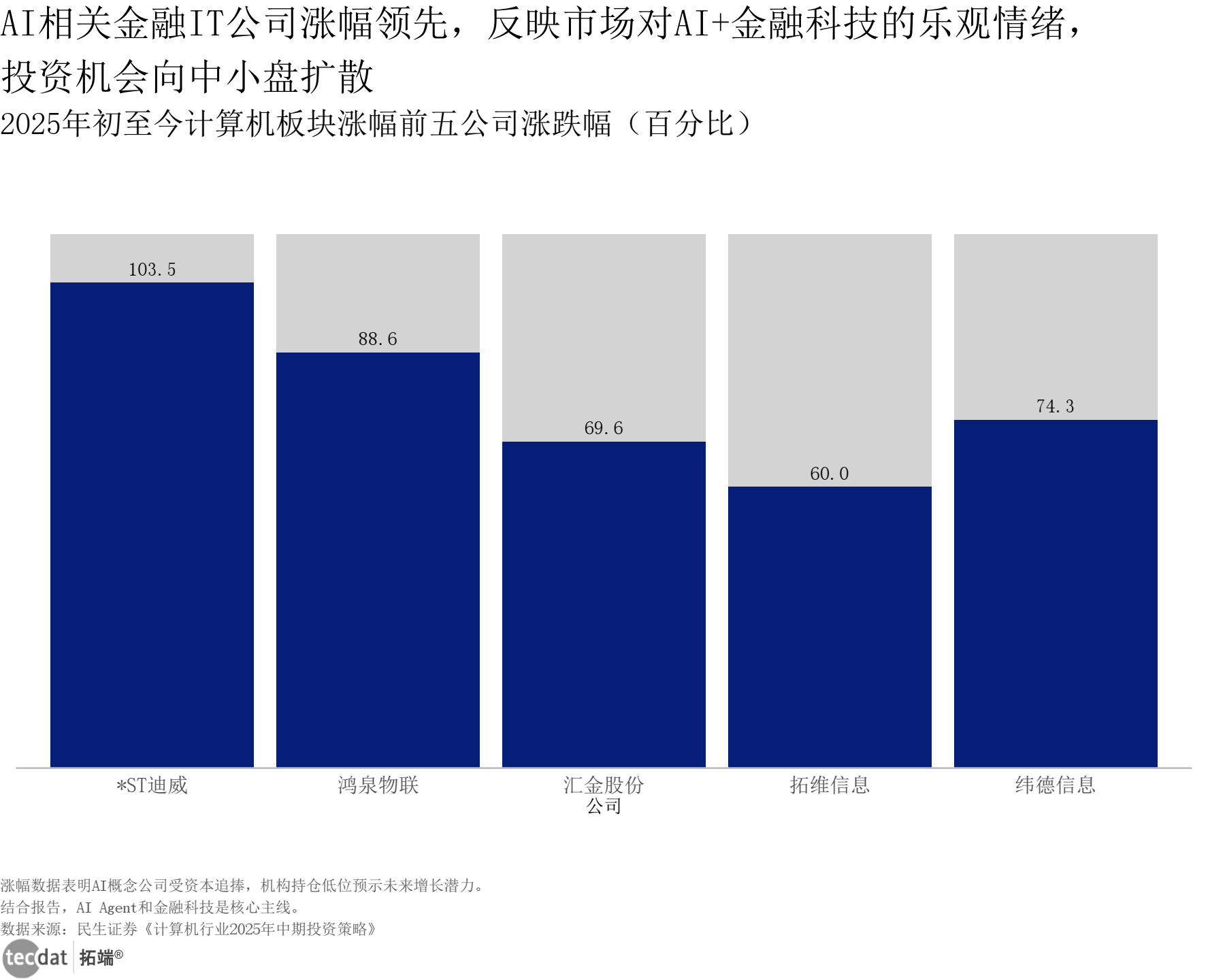 3秒解读:2025年初至今,*ST迪威(103.51%)、鸿泉物联(88.63%)等AI金融相关企业涨幅领先,市场对AI+金融科技概念高度认可。