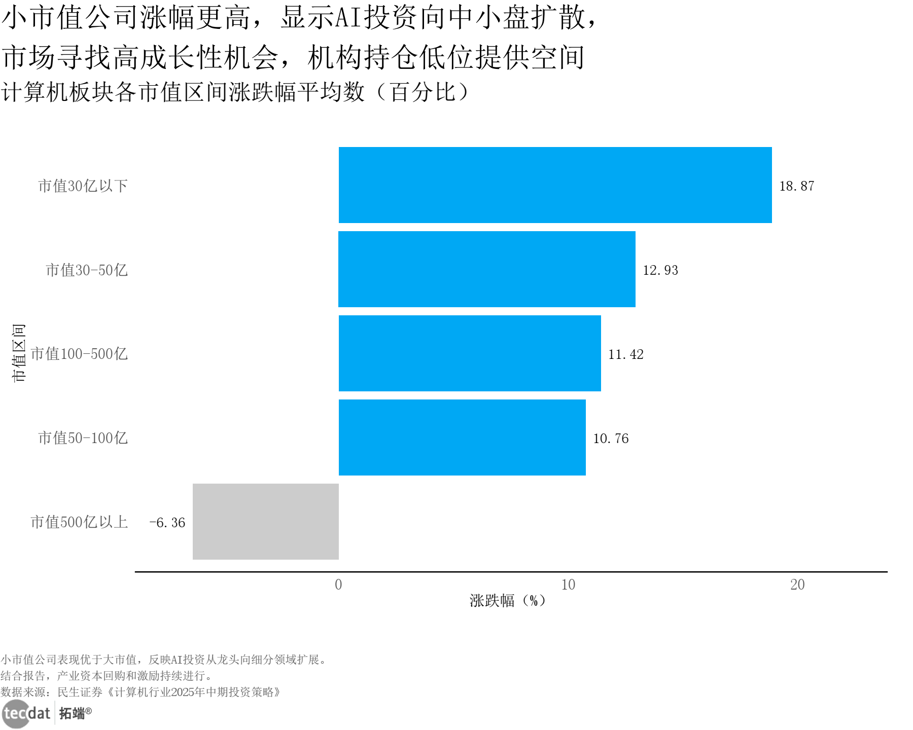 3秒解读:小市值企业涨幅显著高于大市值企业,市值30亿以下企业涨跌幅达18.87%,AI投资向中小盘扩散。