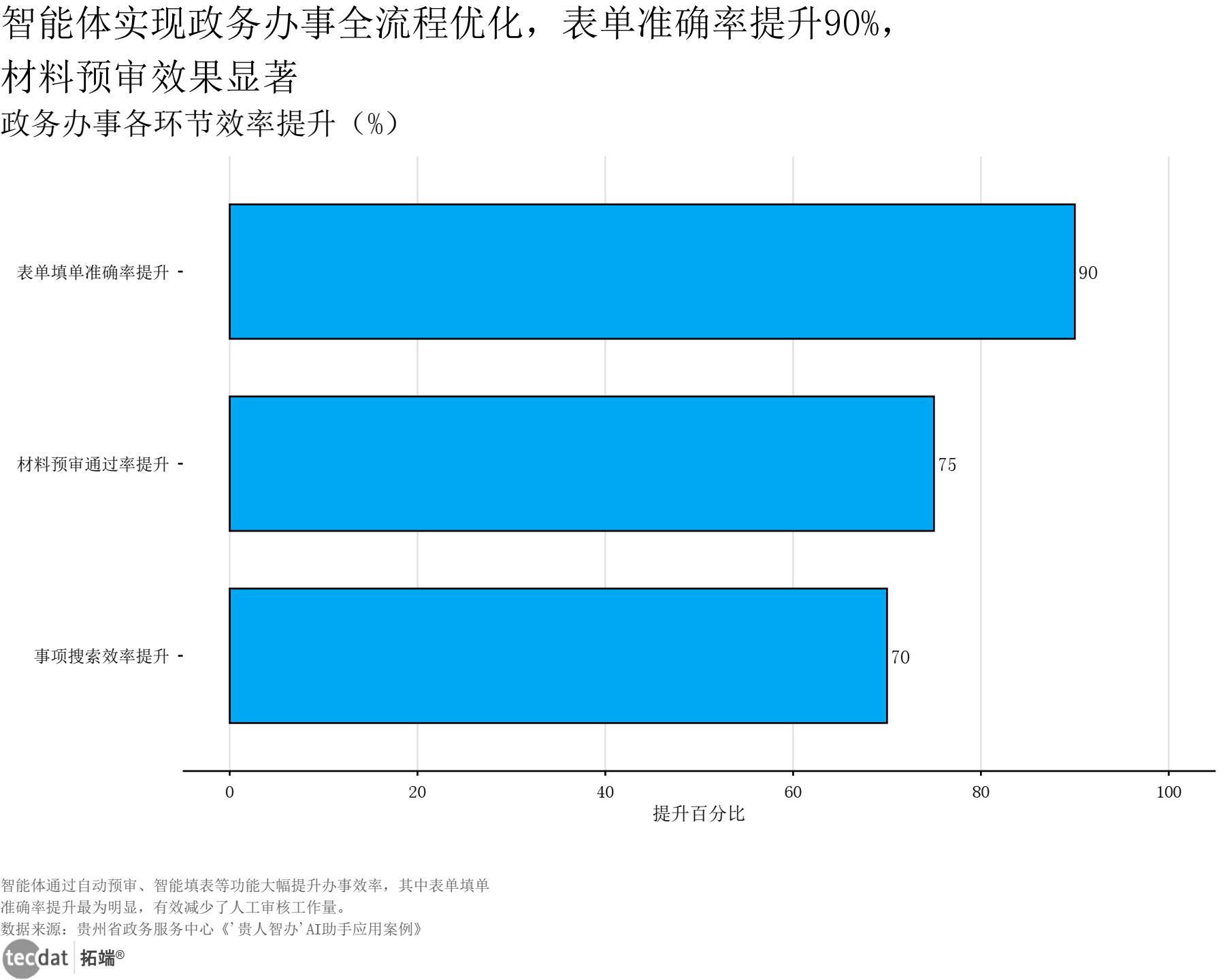 除了核心指标提升,政务智能体还实现了办事全流程的系统性优化:【图表7:智能体效能提升横向条形图】智能体实现政务办事全流程优化,表单准确率提升90%,材料预审效果显著政务办事各环节效率提升(%)