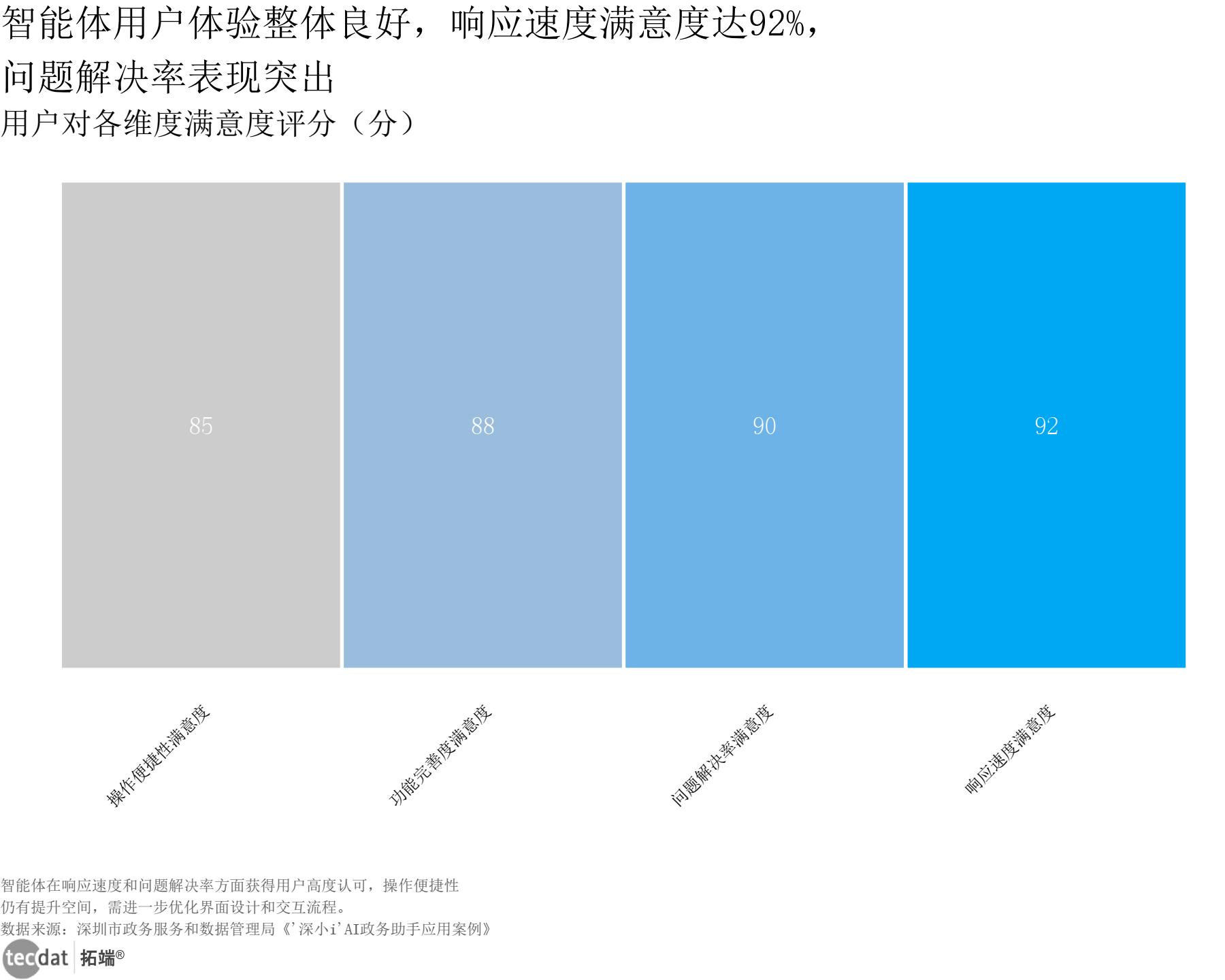 智能体在响应速度和问题解决率方面获得用户高度认可,操作便捷性仍有提升空间,需进一步优化界面设计和交互流程,降低中老年用户使用门槛。数据来源:深圳市政务服务和数据管理局《”深小i”AI政务助手应用案例》智能体用户满意度热力图图表10数据EXCEL及图表PDF模板已分享到会员群3秒解读:响应速度满意度92分,问题解决率90分,功能完善度88分,操作便捷性85分,整体体验优良,用户核心需求得到充分满足。行动建议:产品经理可针对操作便捷性优化界面设计,简化交互步骤,适配不同年龄段用户;客服管理者可建立用户反馈闭环,持续迭代响应话术与问题解决流程;政务部门可将用户满意度纳入智能体迭代考核指标,推动服务质量持续提升。