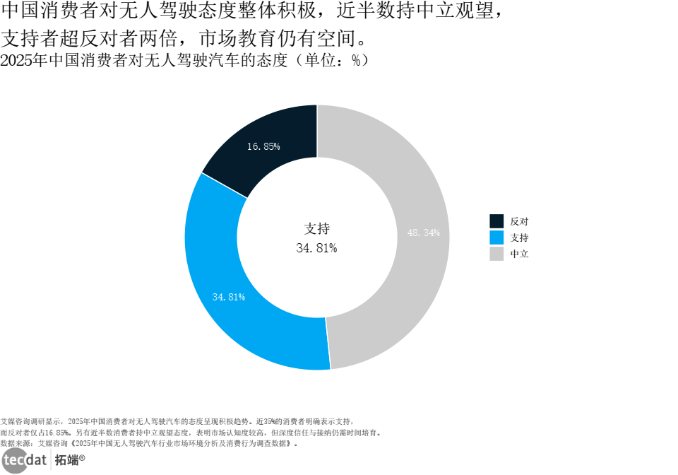 消费者也给出了积极回应。艾媒咨询的调研显示,超过34%的消费者支持无人驾驶,而反对者不足17%。有趣的是,消费者更看重的是安全与环保,而非便捷性。这为技术推广的沟通重点提供了明确方向。