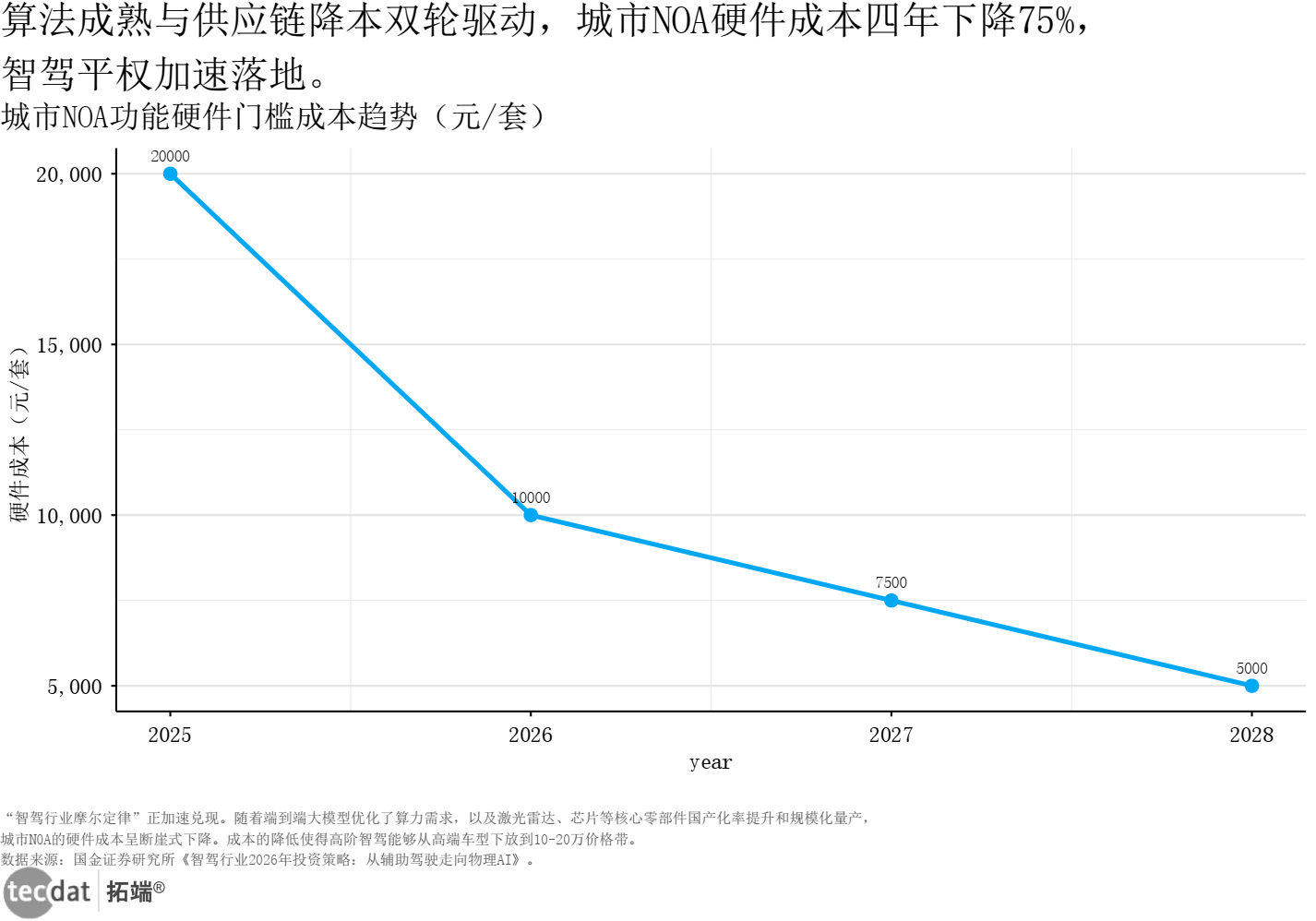 同时,高阶智驾的落地正在推动核心零部件的成本快速下降。城市NOA硬件成本从2025年的2万元/套,降至2028年的5000元/套,四年下降75%。算法成熟与供应链降本双轮驱动,让“智驾平权”加速落地。
