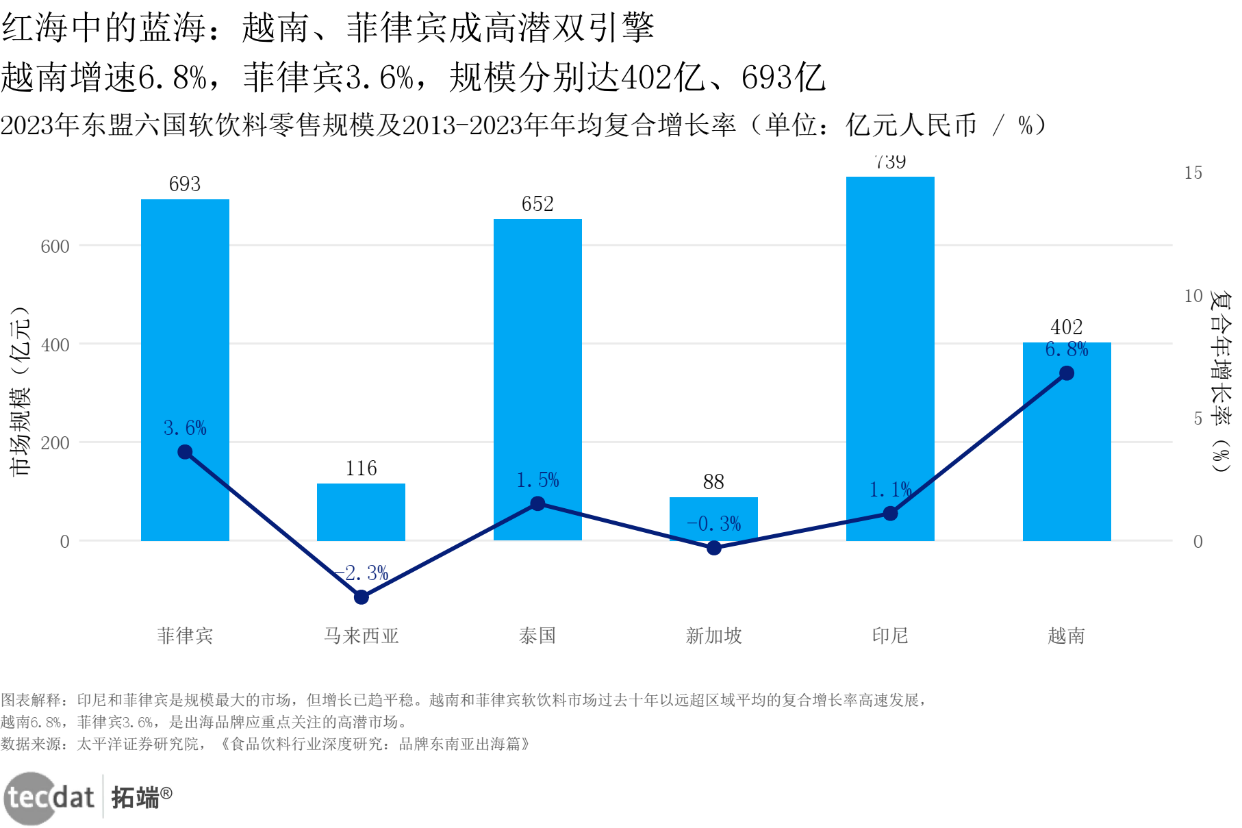 研判一:印尼和菲律宾是规模最大的市场,但越南和菲律宾增速领跑(越南6.8%,菲律宾3.6%),是出海重点。