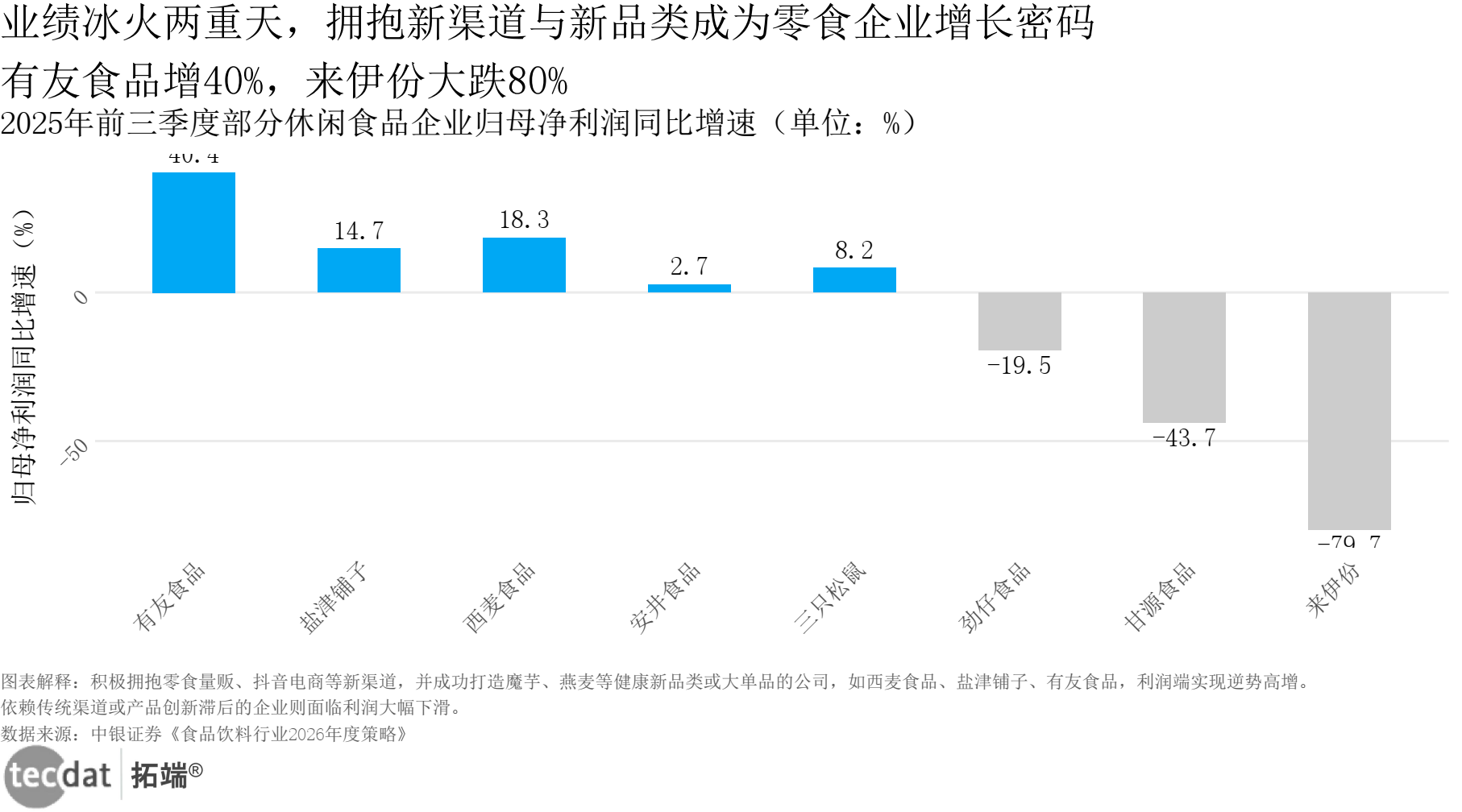 研判五:休闲食品企业业绩冰火两重天,拥抱新渠道与新品类者(如西麦食品、盐津铺子)利润高增,依赖传统渠道者大幅下滑。