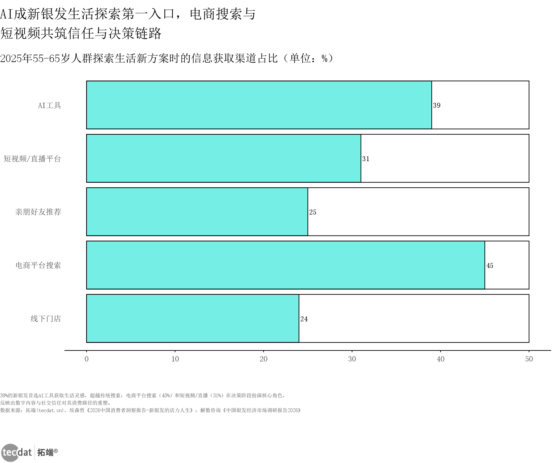 要抓住这群新银发,就必须摸清他们的消费路径。一个颠覆性的发现是,AI工具已经超越传统搜索引擎和线下咨询,成为他们探索新生活的第一入口。