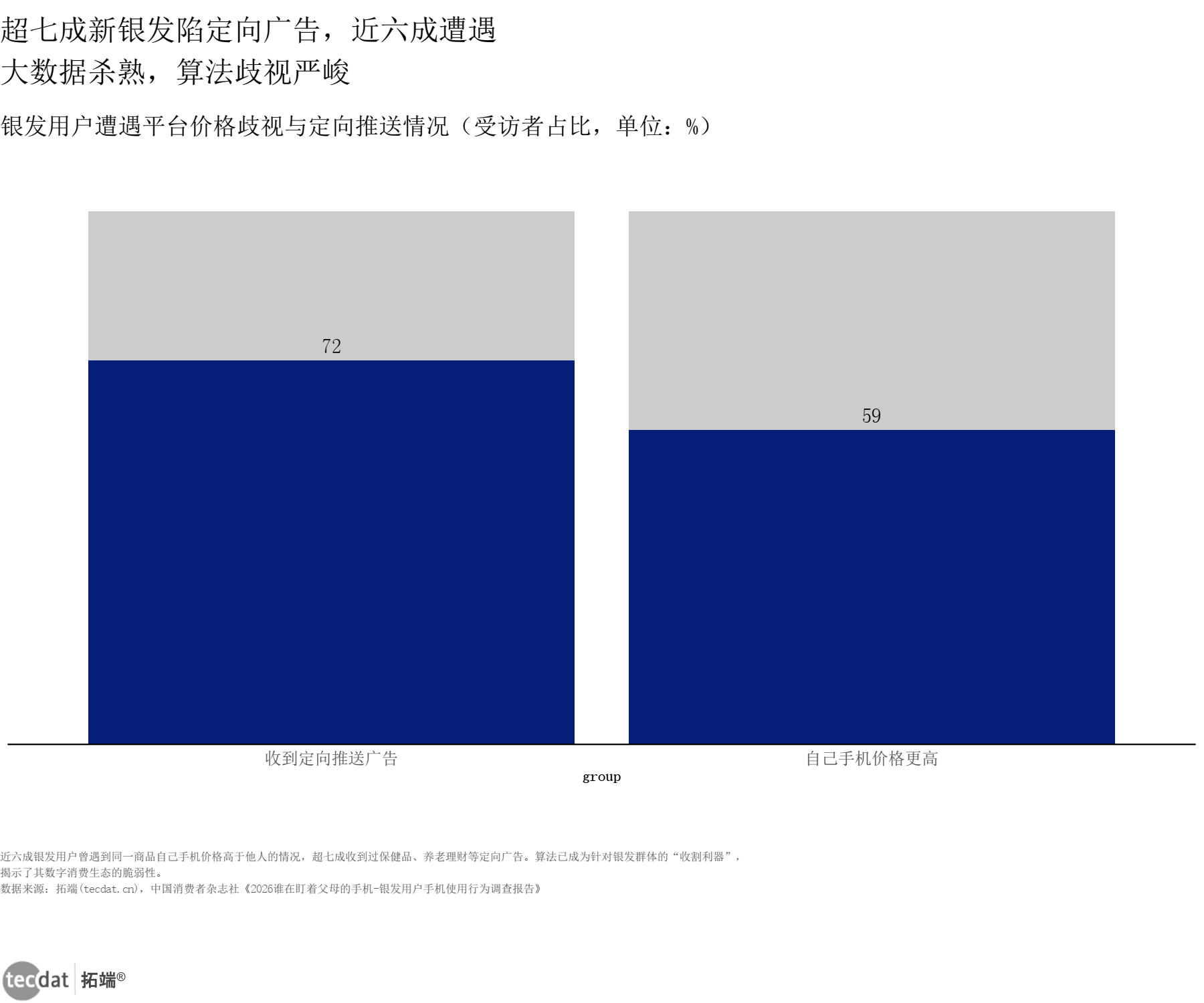 然而,在享受数字生活的同时,新银发也面临着巨大的风险。另一份权威调查《谁在盯着父母的手机?》揭露了令人担忧的现实:高达72%的银发用户经常收到保健品、养老理财等定向推送的广告,更有59%的银发用户曾遭遇”大数据杀熟”——自己手机上看到的价格比家人朋友更高。
